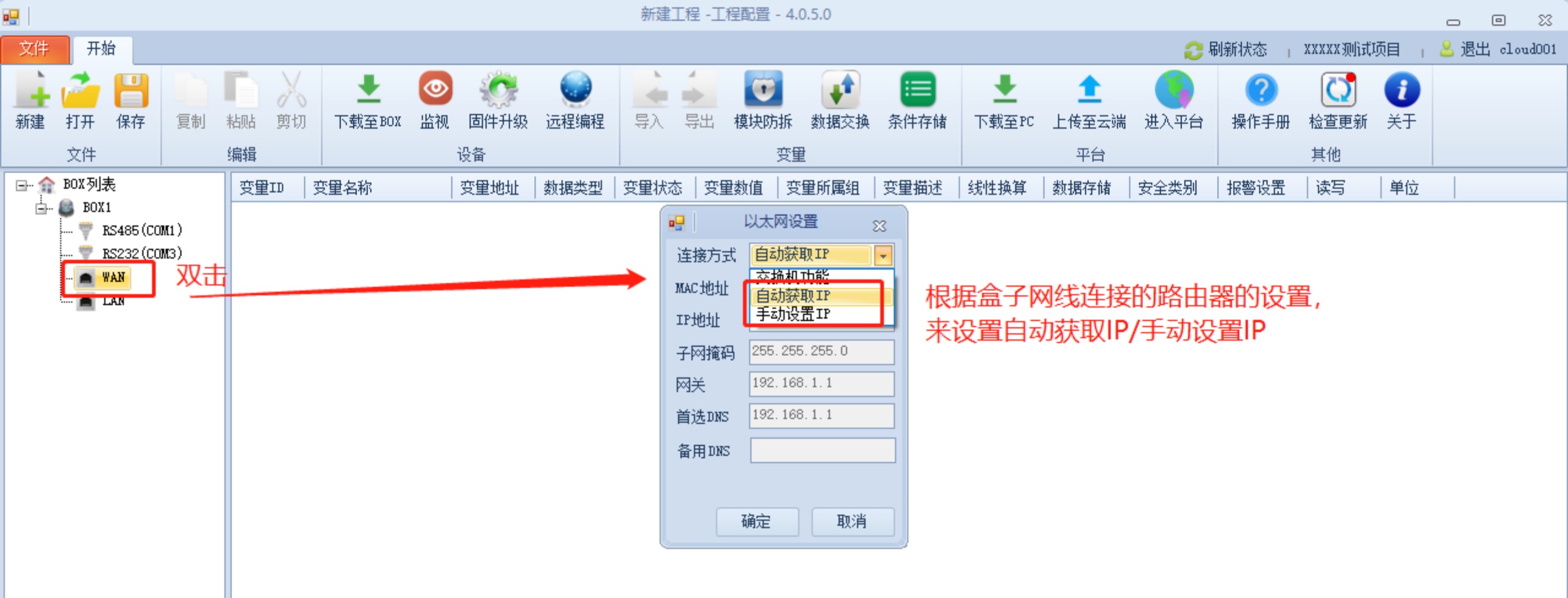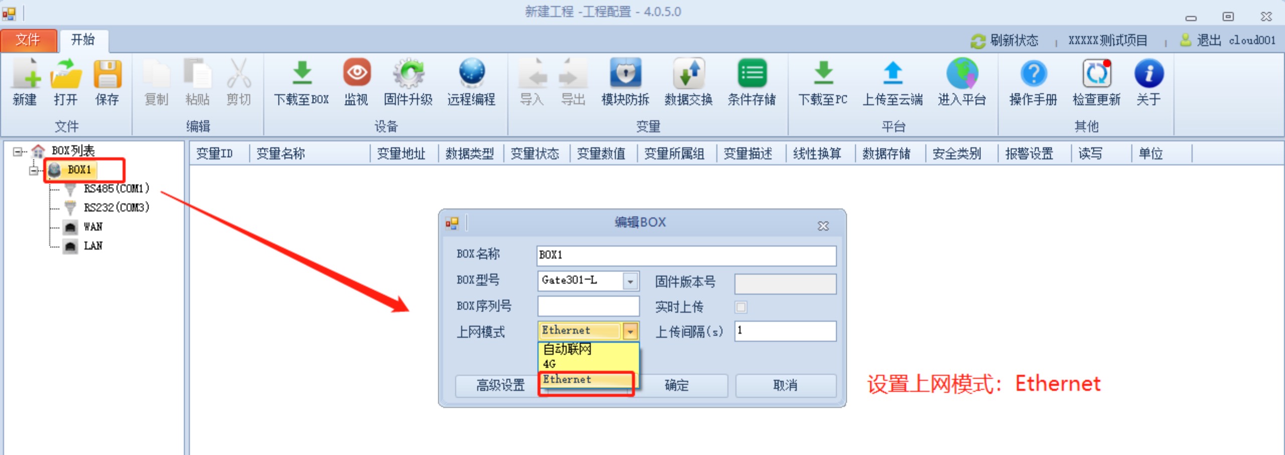 雙擊BOX名稱,在彈出框里設(shè)置完上網(wǎng)模式:Ethernet。