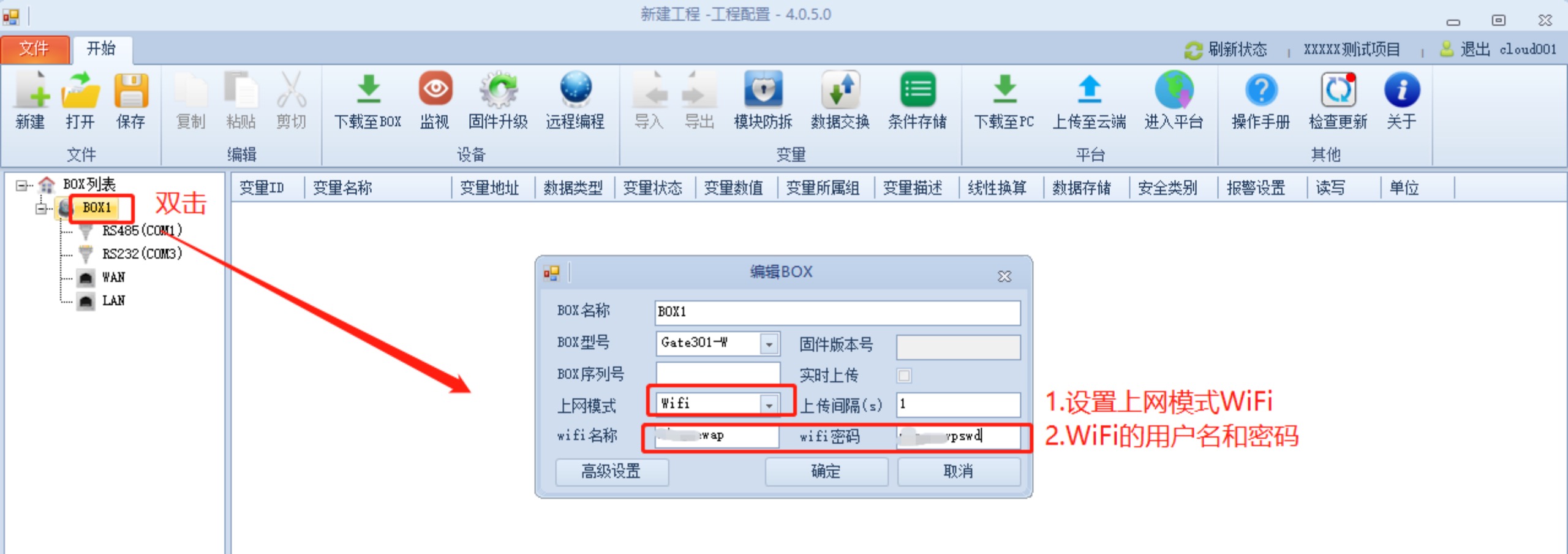 1、 雙擊BOX名稱,在彈出框里設(shè)置上網(wǎng)模式為WIFI,并且輸入WiFi的用戶名和密碼。