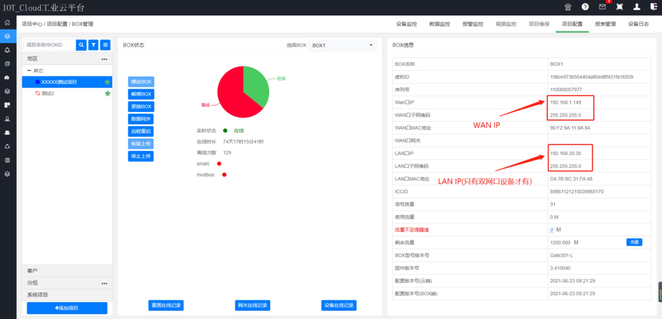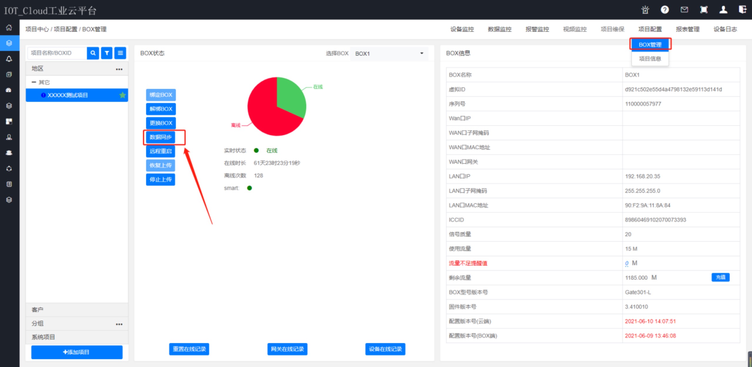 盒子在線的情況,進(jìn)入云平臺(tái),【項(xiàng)目配置】—>【BOX管理】頁面查看。