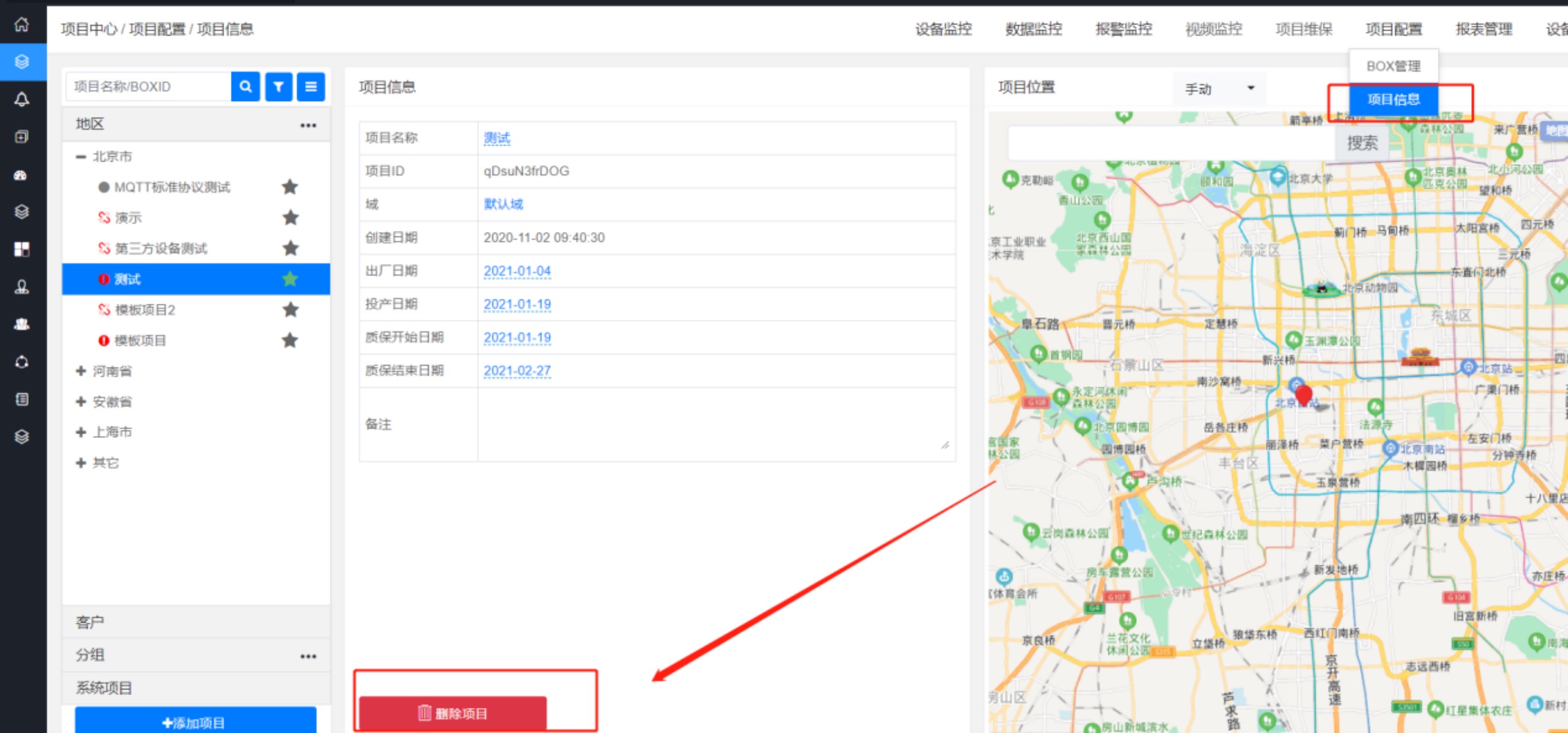 進(jìn)入【項(xiàng)目中心】—>【項(xiàng)目配置】—>【項(xiàng)目信息】,點(diǎn)擊“刪除項(xiàng)目”
